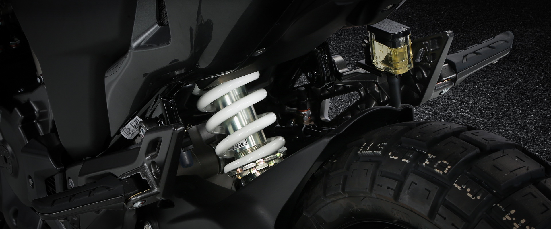 中央后减震采用了内置气囊充高压氮气的设计,降低液压油温度;高速行驶可提供更大的复原阻尼力,同时气囊内高压氮气还可改变减震器内部的空气弹簧特性,