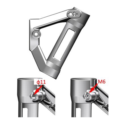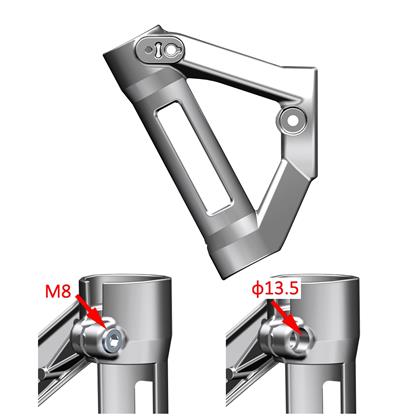 备注:此为旧款,使用2件“1250205-040095 GB70.1内六角螺栓M8×16(环保彩锌)”螺栓固定。可通过观察螺栓头部是否凸出,或测量孔径区分。现已停产,需要购买“4026500-066004 KD200-C大灯左支架(Ⅱ/磨砂银)”+2件“1250205-156000 GB70.1 M6×16内六角螺钉(不锈钢)”。